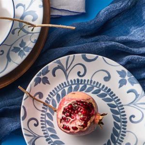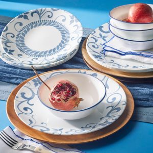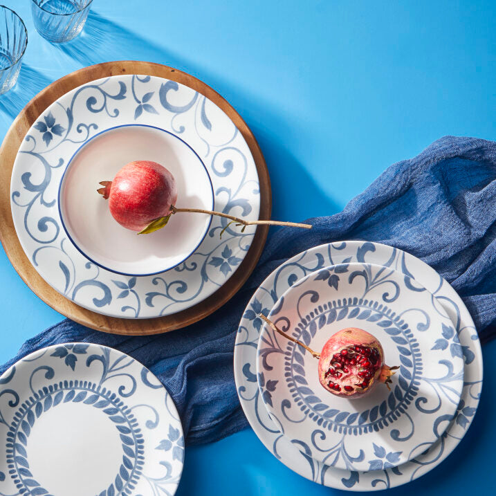 Graceful tendrils in cool blue curl around the border of each plate. perfectly framing your meal. This dinnerware is pretty and brings to mind traditional patterns. but updated for more modern tastes.